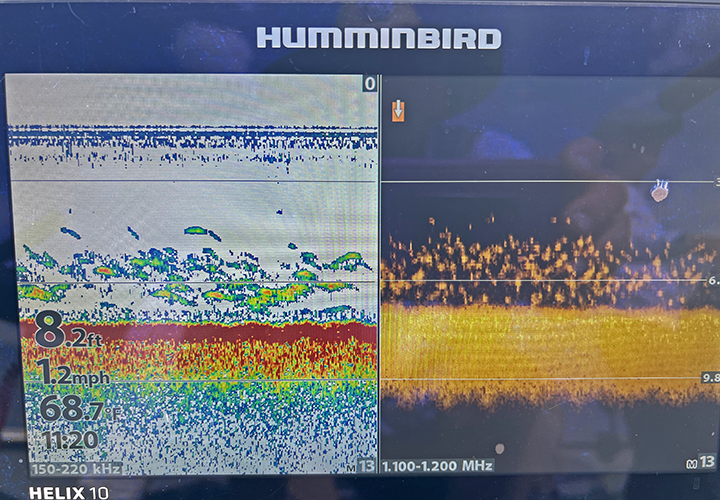 Last week, we reported that summer had past, and that water temperatures had been driven down to the lowest of the low 60s. The cooler temperatures triggered early fall movements of walleye, perch and northern pike. Some fish relocated from deep, mid-lake structure onto shallow water flats. Some relocated from heavy shoreline vegetation that begun dying and showing up on those same shallow water flats. The result, scenes like the one you see pictured here, large, mixed schools of perch, pike and walleye, feeding on minnows and small, young of the year gamefish.