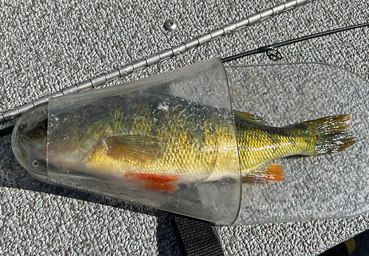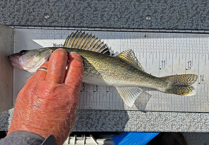 The size structure of walleyes from the 2023-year class is improving. Throughout the summer we’ve been monitoring and documenting their growth. This fish, measuring in at 14 inches, is typical of fish from that year class. It is not unreasonable to harvest some of these fish for a meal, and we expect to see some of them in the fish cleaning shack this fall. That said, it would be nice to preserve some of them for one more season so as to let them spawn next spring. Besides the benefit of producing more fish for the future, their average size will improve for the 2026 season, making that an ideal time for harvesting them.